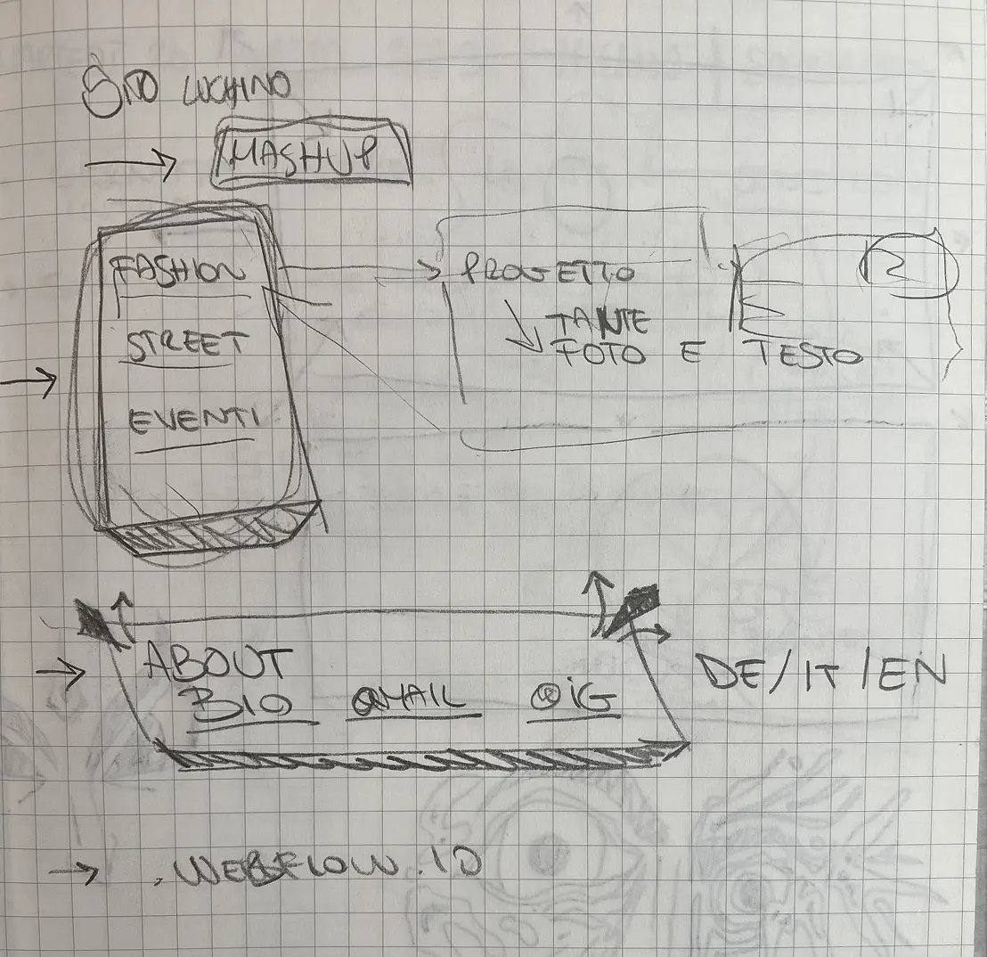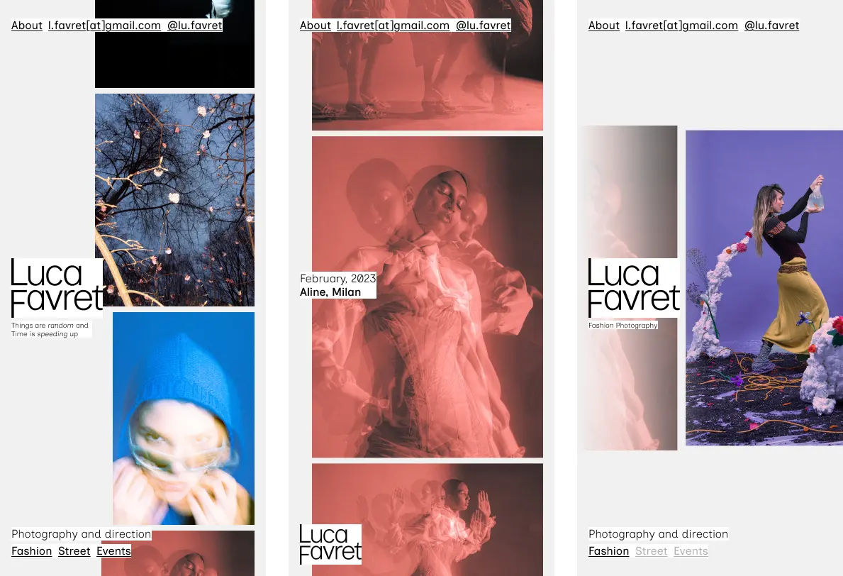 After initial client discussions, the goal was to create a portfolio site that doubles as a business card—suitable for studio meetings and more casual settings, with a strong focus on mobile. The flow needed to be direct, allowing viewers to explore Luca's work without distraction and understand his practice. Projects were organized into fashion, street, and events. Visual research examined other industry professionals' sites, noting that too many or too-small images diminished their impact.